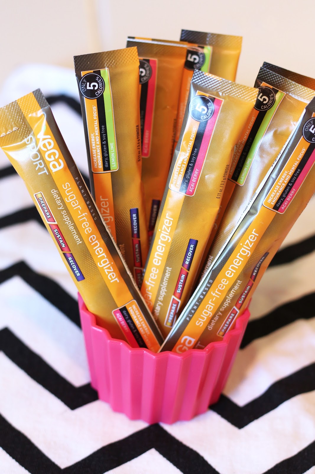 Some of you may remember a post I did last month, introducing you to one of my new favorite companies, Vega. They have so many great products, like their delicious nutritional shakes and bars. They recently released their Sugar Free Energizer and were so kind to send me some samples to try (this girl loves getting mail!). They are a part of the Vega Sport line and are designed to be taken before your daily run or low intensity workout. Need a energy boost or enhanced mental focus before pilates or yoga? This Sugar Free Energizer is just what your body needs!